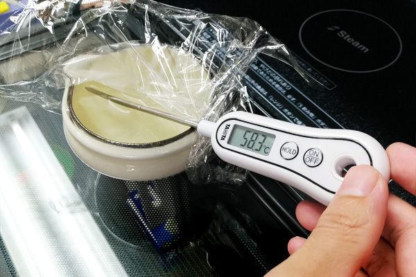 ▲次に熱燗と言われる50度あたりを目指し600wで90秒温めました。結果は熱燗と呼ぶには高い58.3度になってしまいました。実践したスタッフは悔しがっていました。