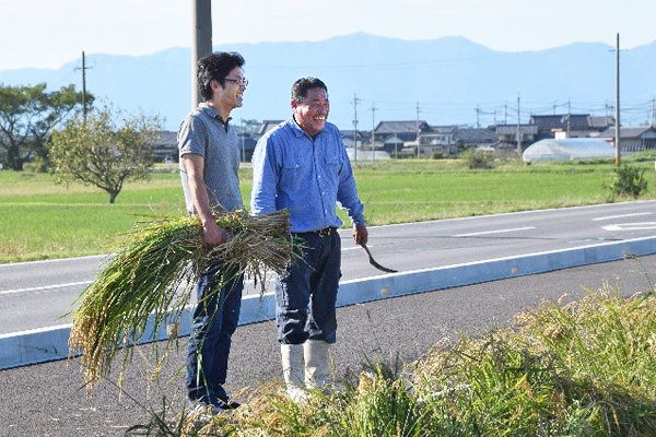 ▲松の司の酒造りを支える竜王町酒米部会の菱田善弘さん(右)。ちょうど最後の稲刈り中でした。
