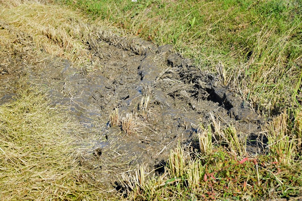 ▲山田錦と好相性の粘土質。水や肥料を保ってくれるので、ふくよかで詰まった質感の米が育つ。