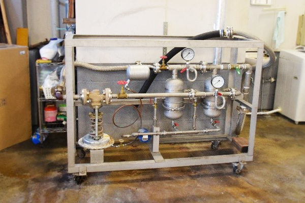 ▲写真の機械で水分を取り除いた蒸気を甑に送り出します。