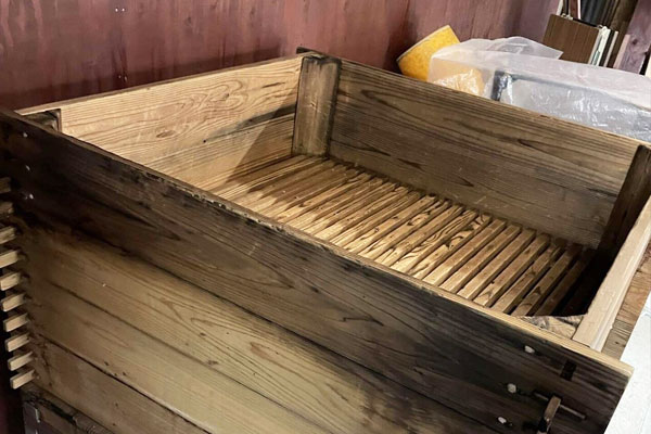 ▲勝木チルドレンの証、四角い甑。森嶋専務曰く、蒸米は野球に例えるとピッチャー。蒸米がないと始まらないからだそうです。この甑を使用することで蒸し上がりがパラパラになり、格段に麹米のレベルが上がったそうです。