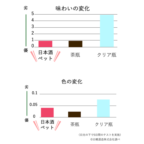上のグラフが日光の下に5日間DLCペットボトルと茶瓶、そしてクリア瓶を置いた検査結果です。グラフを見てもわかる通り、茶瓶と同程度の性能だということが分かります。蔵元が丹精込めて醸した純米吟醸や、純米大吟醸といった上質なお酒を安心して託すことができます。