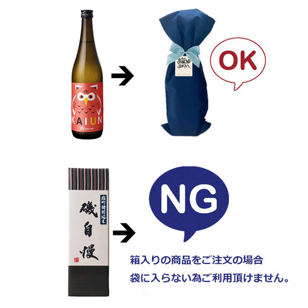 商品を紺色の不織布の袋にお入れし、リボンと「祝」のメッセージタグをお付けいたします。こちらのラッピングをご利用いただける商品は下記の通りです。