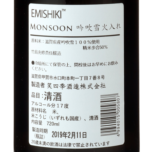 独創的にして美味なる酒と感動を、より多くの人に伝えたい明治25年創業。巡る季節…花が咲き誇り笑う山、太陽の日差し、照紅葉、冷たい風。酒銘にある「四季」の移ろいの儚さ、自然の美しさと醸造責任者 竹島充修がそこから感じる思い出、憧れ、様々なインスピレーションに基いて笑四季の酒質とコンセプトは設計されています。 笑四季の哲学である「天地自然の理に従う」のもとに、滋賀県内の目の届く範囲だけの優良な原料米を選びぬき、手作業と最新技術の融合により、五感を研ぎ澄ませながら寒造りを行なっています。