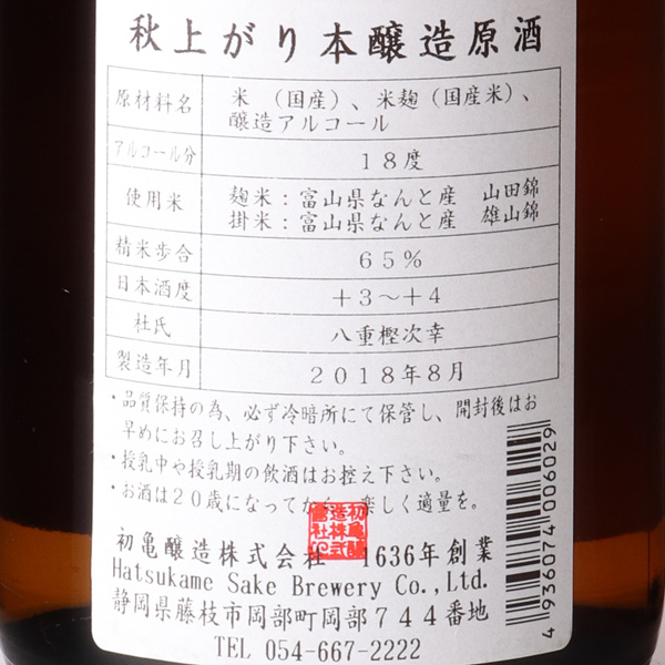 高品質の玉露の産地だけでなく、高品質の日本酒もあります!寛永12年、1636年創業。現在の静岡市で創業し、明治初期の頃に現住所である岡部町に移りました。岡部町は東海道五十三次の宿場として栄えたことで有名で、初亀は旅人の癒しとして愛されていました。現在では高品質の玉露がとれることでお茶が有名です。そんな蔵元の酒造りは、兵庫県東条産の山田錦を始め、富山県南砺産の五百万石、雄山錦とこだわった原料を蔵内に流れる南アルプスの伏流水で醸します。量より質にこだわり、お客様の為に日々酒造りに勤しんでいます。