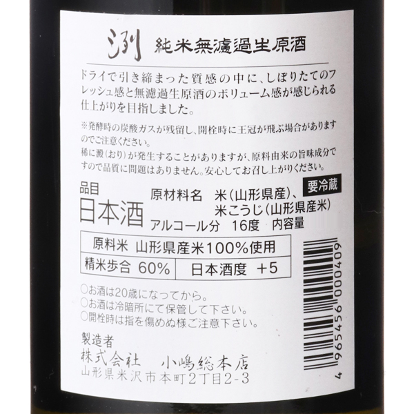 爽やかな香り、新酒由来のかすかな麹香。無濾過生原酒の密の詰まった力強い味わい。フレッシュでドライ。山形県産米を使用。蔵紹介