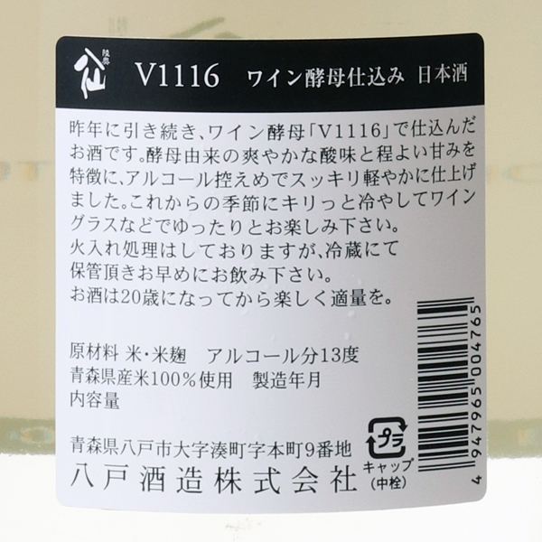 デンマーク原産ワイン酵母V1116はフレッシュな白ワインを醸す際に使われる酵母です。酵母由来の爽やかな酸が特徴的で、後味すっきりと仕上げています。白ワインのソーヴィニヨンブランやフランスのリースリングの様に若々しく、キレイな酸が乗った1本です。食中酒としてよく冷やしてお楽しみください。白身魚のカルパッチョやムニエル、鶏のから揚げやペペロンチーノなどが特におすすめです!蔵紹介
