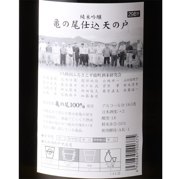 秋田県産の亀の尾55%を使用。優しく広がる吟醸香と、柔らかくふくらみのある口当たり。亀の尾由来の味、「ニガシブ」を感じる深みのある味わいとキレ。蔵紹介