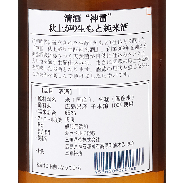 課せられた使命は、先人たちが築き上げた清酒という文化を伝承し、生活の潤いを、人生の喜びと悲しみを、共に味わっていくこと1716年創業。酒銘の神雷の由来はその昔雷が酒造蔵に落ちたが、大過なかったこと、また神石にあやかった事から。ちなみに稲妻は稲の妻と書くとおり、豊かな恵みをもたらす象徴であることから、大変縁起の良い名前です。酒蔵は中国山脈の山あい、標高500mに位置し、冬場は氷点下を記録します。さらに夏場も涼しいため、お酒の仕込、貯蔵共に大変適した環境が整っています。また、裏山の井戸から軟水、蔵の地下からは中硬水が得られ、用途によって使い分けが出来るのも特徴となっています。