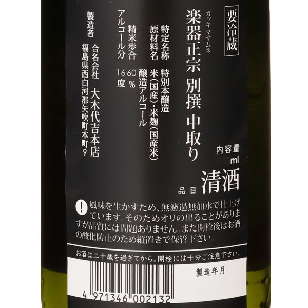 楽器正宗 特別本醸造 別撰の中取りバージョンです。夢の香を無濾過で瓶詰。瓶火入れ後は急冷するなどこだわりをもって醸した一本です。マスカットを思わせる爽やかな香りがやさしく広がり、ほんのりとした甘みと心地よい酸味が印象的です。後口のキレも良く、軽快で爽やかな味わいに仕上がっています。蔵紹介