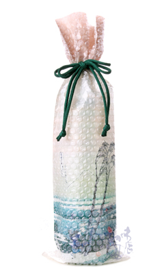 2018年度グッドデザイン賞を受賞。緩衝材の機能を併せ持つラッピング袋「浮世絵プチプチ」かつて陶器の輸出の際に緩衝材として用いられていた浮世絵が、西洋の人々を驚かせた事に着想を得て生まれました。四合瓶用、一升瓶用の2サイズのご用意です。日本酒はもちろんワインや焼酎などにもご利用いただけ、特別なギフトラッピングとしておすすめです。「葛飾北斎の富嶽三十六景 駿州江尻」が描かれています。