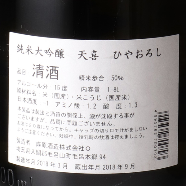 日本酒だけでなく様々なお酒を醸し注目を集める蔵元明治15年、1882年創業。初代創業者、麻原善次郎は滋賀県琵琶湖の畔に生まれ、青梅地方の酒蔵での奉公後、現在の埼玉県西部、自然が残る奥武蔵地方の毛呂山町にて開業しました。主要銘柄「琵琶のさゝ浪」のほか、梅酒やリキュール、ワイン、ビールなど多岐にわたる酒類を醸す多彩な蔵元です。新銘柄「天喜」は「綺麗で食事に合わせやすい味わい」と「コストパフォーマンス」を追求したブランドです。飲んだ人が笑顔になれる、心地よい味わいをお楽しみ下さい。