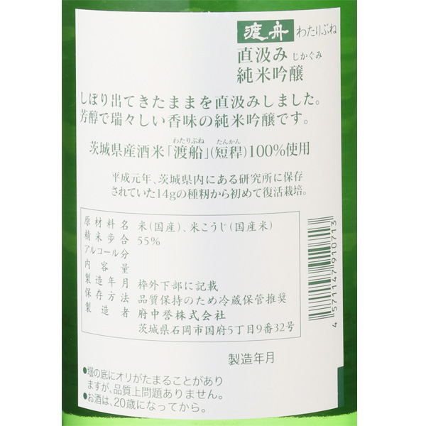 幻の酒米復活に尽力した蔵!創業1854年。府中とは茨城県が常陸国と呼ばれていた当時、蔵のある石岡市に国府が置かれたことに由来しています。蔵元は酒米の最高峰、山田錦の親として知名度の高い短稈渡船(たんかんわたりぶね)の復活に尽力したことで有名です。短稈渡船とは、野生種であり、品種改良によって生まれた酒米ではありません。収穫時期が遅いことや、病気になりやすいなどの育成の難しさから、栽培する農家が途絶え、蔵元が見つけるまで幻の酒米となっていました。そんな蔵元のこだわりは酒米だけに終わりません。