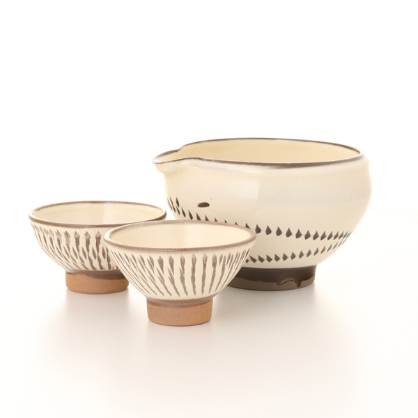 大分県日田市の北部の山あいで焼かれる小鹿田焼(おんたやき)は、300年もの間、脈々と受け継がれてきました。古風で味のある柄でありながら、現代のテーブルにもスッと馴染む佇まいが人気です。全てが手作りのため、それぞれに世界に一つしかない模様が刻まれています。酒器の縁が口にフィットしやすい曲線となっており、飲むお酒の口当たりがとても優しく感じられます。無駄のない形に仕上げられており、お酒のうまさを一層引き出します。ぐい呑み×2 片口×1 木箱入