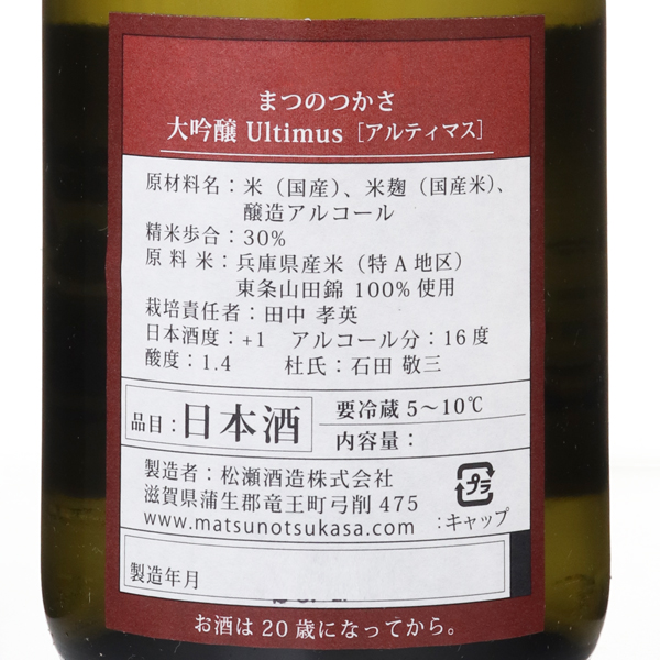 『松の司』の歴史の中で一つ一つ積み重ねられた日本酒造りの技によって丁寧に醸し出されるモダンに洗練された大吟醸酒。原料は酒米栽培の特A地区である兵庫県産東条山田錦の特上米を30%まで精米した最高のものを使用しています。根源的な、究極の、といった意味を併せ持つ Ultimate の語源である Ultimus(アルティマス)という名を冠した『松の司』の最高峰です。通常は1年以上の熟成を経ての出荷となる当蔵の大吟醸クラスの中で、新酒のフレッシュさを感じさせながらも穏やかな品格を持った唯一無二の味わいを心ゆくまでお楽しみください。上立香は穏やかながら果実の様な香り。口に含むと洗練されたお米の甘味や果実味が広がり、心地よい酸が絶妙なバランスで全体にハリを与えます。余韻は長く、ハイクラスならではの風格のある味わいに仕上がっています。