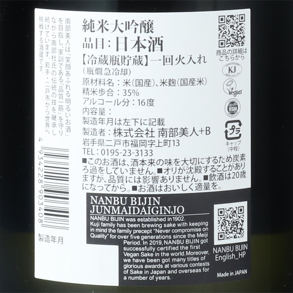 岩手の人気銘柄・南部美人の最高峰に位置する「南部美人 純米大吟醸」。35%まで磨いた山田錦を使用し、中硬水である折爪馬仙峡の伏流水で丁寧に醸されました。芳醇な香りと濃密な味わいがバランス良く表現されています。香味の調和、ふくらみ、存在感を示しながらも透き通るような繊細な旨み、後切れが絶対的な秀作です。注意事項