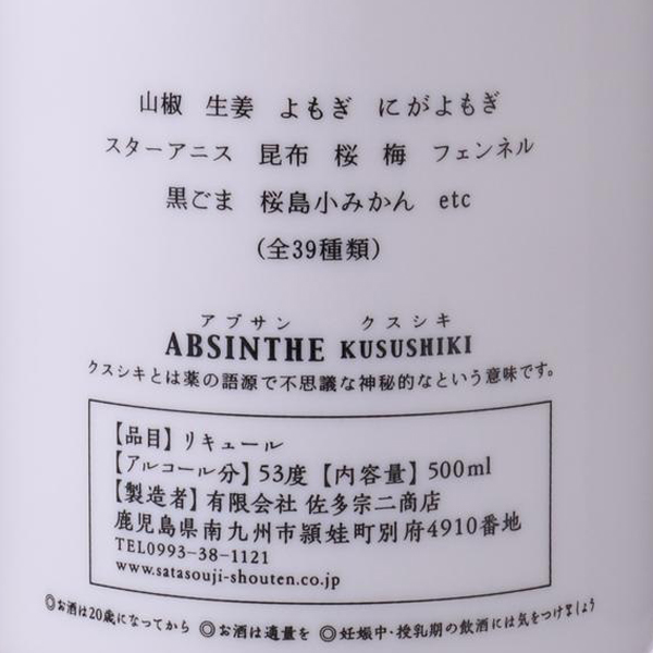 ニガヨモギ・スターアニスを中心に39のボタニカルを使ったアブサンです。アルコールでハーブ・スパイス・果物・野菜などから香りやエキスをふんだんに抽出して、とても複雑味の溢れる仕上りになっております。15世紀、錬金術師が蒸留の技術を使い薬を作っていたと言われています。その薬の延長線上にアブサンはあると言われています。そして薬の語源くすしきには不思議な、神秘的なという意味がございます。アブサンは昔から多くの文化人、芸術家を魅了してきた神秘的なお酒です。蔵の畑で作っている完全無肥料・無農薬のニガヨモギを使っております。瓶もこだわり、液体に紫外線からのストレスがかからないように、薬を入れる素材のものを使用しております。蔵紹介