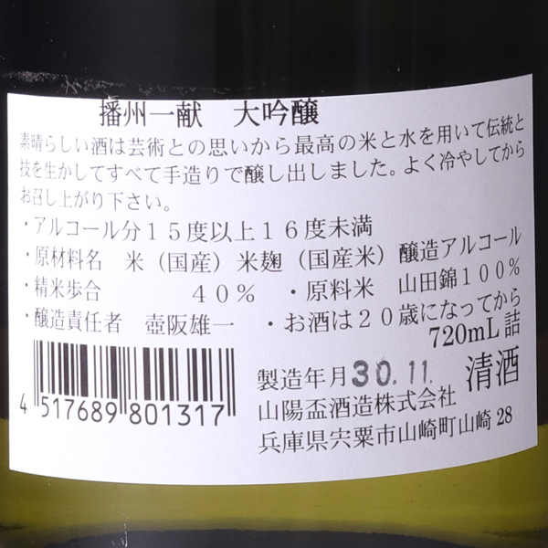 手間・ひまを惜しまず山陽盃酒造は天保8年、1837年創業。揖保川のほとり、旧城下町である兵庫県宍粟市山崎町に、中国山脈の奥深くより流れ出る清流に抱かれ、大自然の恩恵を受け酒を醸しています。江戸時代から使われている仕込み蔵で造られた酒は、瓶詰され明延鉱山の中にある、明壽蔵に運ばれます。ここは一年を通して、気温が9度前後に保たれる天然の冷蔵庫です。遮光性が高く、温度が一定の環境は日本酒をじっくりと熟成させるのに最適で、この蔵で熟成させた酒は驚くほどまろやかな味わいに仕上がります。播州一献には播州地域の良質の米・水・環境を使い地酒本来の持つ良さを大切に醸したお酒をどうぞ、との想いがこもっています。現在では杜氏の壺坂専務を中心に、兵庫三大錦のひとつ北錦で醸す等、味わい豊かな食中酒を醸し多くの日本酒ファンに親しまれています。