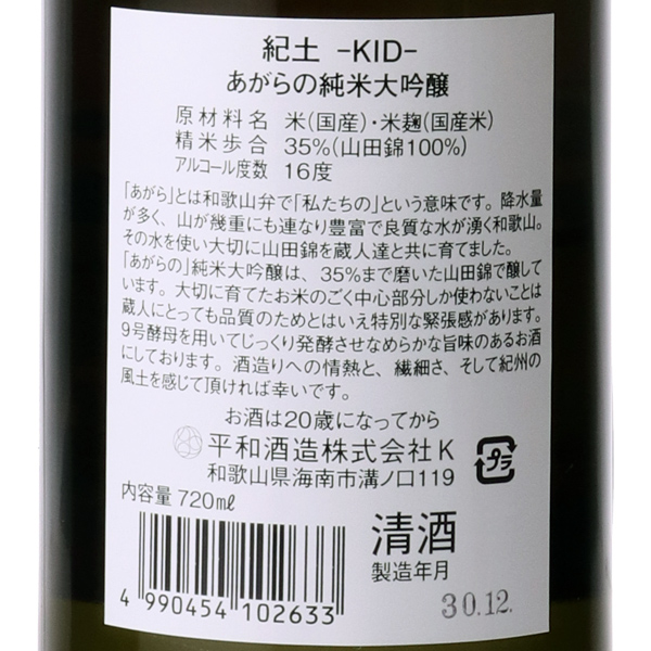 あがらとは和歌山で私たちのという意味の方言。蔵人が育てた酒米で造った、想いが込められたお酒です。ほのかなかおりにで口の中に旨みが広がり、エレガントで優しく柔らかさがすっと流れていきます。蔵紹介
