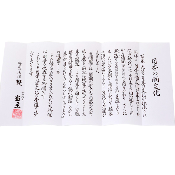完全無添加の純米酒にこだわる蔵の創業から変わらない伝統的な手造り による酒造りを今も守り続けています。現在梵が酒造りで使うのは、米と米麹と水の3つだけ。余分な添加物は一切加えません。大量生産することはできませんが、「体に優しく、心からうまいと言ってもらえる日本酒をつくり続けたい」そんな先代からの思いを受け継いでいます。