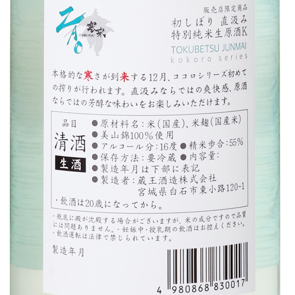 寒来はさむらいと読みます。厳しい寒さがやって来る時期に蔵出しされるしぼりたての新酒。直汲みならではの爽快感と原酒ならではの芳醇さを味わうことが出来ます。またこの酒名には、覚悟を持って酒造りに臨むという思いも込められています。商品名のKは限定流通品の新ブランド「ココロシリーズ」。蔵紹介