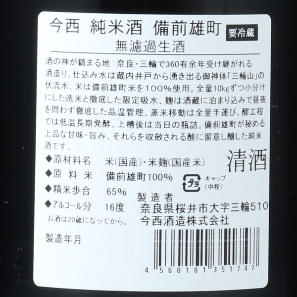 みむろ杉を醸す今西酒造のもう一つの顔となる銘柄今西の雄町で仕込んだ純米酒。しぼった無濾過生のまま翌日には即瓶詰めを行うので、鮮度抜群のフレッシュさ、やや微発泡なニュアンスがあり、とっても爽やかです。その中にも、雄町らしい甘やかで酸味のある味わい、今西酒造らしい透明感のある旨みが感じられます。蔵紹介