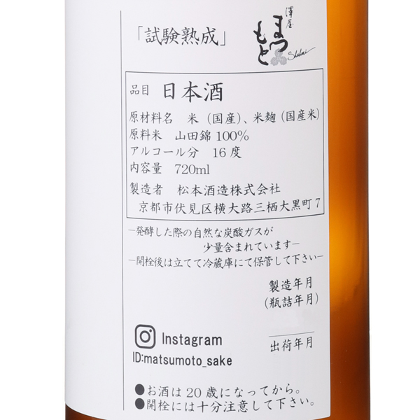 原料に勝る技術は無し!1791年創業。京都市伏見の歴史ある酒蔵で、赤レンガ蔵と八角形の煙突が印象的な酒造蔵は、近代化産業遺産に指定されています。澤屋まつもとのコンセプトは、守破離 (しゅはり) 。澤屋まつもとの伝統を守ること。伝統を破り、他で学んだことを実践すること。守と破を大切に、そこから離れて新たな価値観を見出すこと。京都の酒蔵として、京都の水、良質な米の旨みを表現。透明感、旨み、爽やかさ、シンプルな中に、エネルギーを感じられるお酒です。