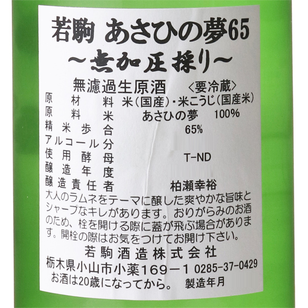 地元栃木県産のあさひの夢65%精米を使用。大人のラムネをテーマに醸した、香り穏やかで綺麗な甘味と柑橘を思わせる味わい。若駒の中ではドライな酒質に仕上がっていて、フレッシュでシャープなキレがあります。商品によって、若干の活性を感じます。蔵紹介