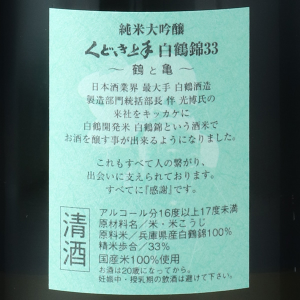 酒米の王様と呼ばれる山田錦を越えるべく、白鶴酒造が独自に開発した酒造好適米が「白鶴錦」。高い知名度と技術力を誇る酒蔵が続々と白鶴錦を用いた酒造りを始め、素晴らしいお酒を世に送り出しています。「くどき上手」からも、白鶴錦の大吟醸向きで軽やかな味わいに仕上がる特性を大いに生かした日本酒が生まれました。「くどき上手」らしい可憐な香りに、広がりのある甘味と繊細な酸が見事に調和しています。ラベルには鶴と亀が描かれ、千年万年のご縁、お祝いごとにぴったりなお酒です。