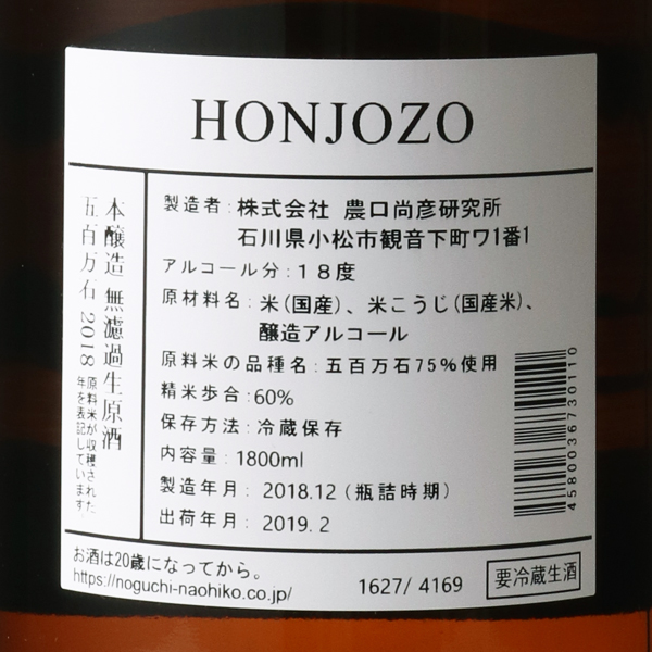 農口尚彦研究所 本醸造 無濾過生原酒 2018