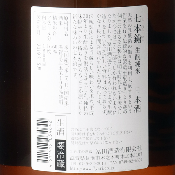 かつて蔵で行われていたきもと造りに挑んだ1本。七本鎗らしさを感じさせつつも、独特の旨味や酸、そしてコクを感じさせる味わいです。厳しい栽培基準をクリアした環境こだわり米認定の滋賀県産玉栄を60%精米し仕込んだ純米酒。蔵紹介