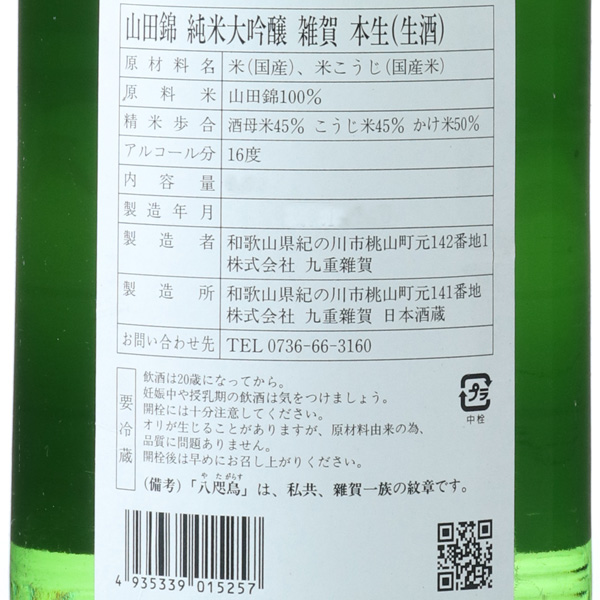 雑賀ブランド、純米大吟醸のしぼりたて本生です。上品な吟醸香とともに、新酒ならでのフレッシュ感とスッキリとしたキレがあり、酸味と甘みのバランスよいフルーティーな味わいが特徴です。香りはしっかりありますが、派手ではないので和洋中のお料理によく合います。蔵紹介