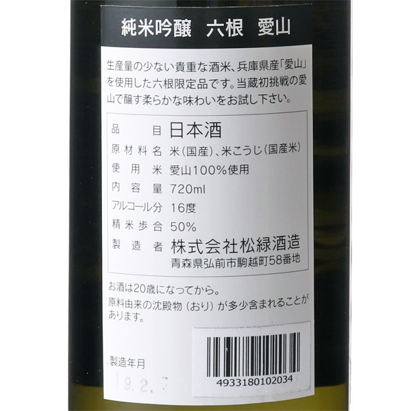 愛山50%精米を使用。生産量の少ない貴重な酒米、兵庫県産「愛山」を使用した六根限定品です。愛山ならではの柔らかな味わいをお試し下さい。ワイングラスで美味しい日本酒アワード2019金賞受賞。蔵紹介