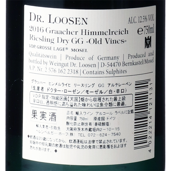 極めてフルーティなワインを産出するヒンメルライヒ(天国)畑産の最高級白ワインです。グラーハーはベルンカステルとヴェーレンの間にある小さな村です。このブドウ畑の南西向きの急斜面と土壌では、ヴェーレンの優雅さとベルンカステルの力強さを組み合わせたワインが生まれています。土壌中のブルースレートの強力なミネラルのおかげで、グラーハーのワインは優れた熟成へのポテンシャルも秘めています。 等級:グローセス・ゲヴェックス / 味わい:ドライ蔵紹介