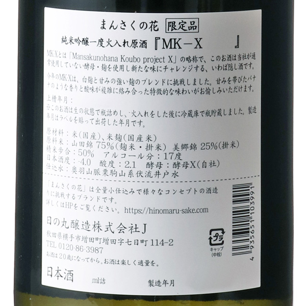 山田錦と秋田県産日の丸50%精米を使い、白麹をわずかに使い醸しました。白麹と甘み強めの麹をそれぞれ別々に造り、配合しています。甘みを帯びたバナナのような香りが特徴です。白麹由来のクエン酸が非常に爽やかで、日本酒とワインの中間のような味わいです。蔵紹介
