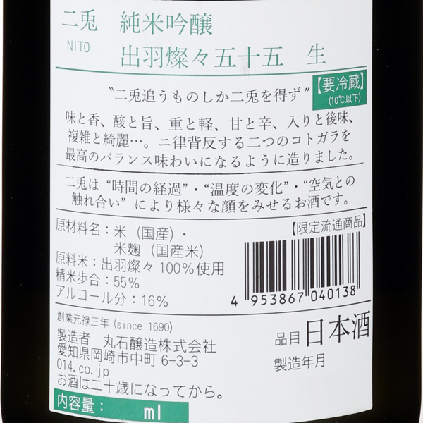 成長を続ける「二羽の兎」1690年に創業の老舗蔵。蔵の代表銘柄「二兎」は”二兎追うものしか二兎を得ず″という考えより名付けられました。「味」と「香」、「酸」と「旨」、「重」と「軽」、「甘」と「辛」の様に反する二つの事柄が生む最高のバランス・味わいを求めて酒を仕込んでいます。原料米は種類は多く使わず、全国的にも使われている「山田錦」と「雄町」がメイン。古くより酸と甘さにこだわり日本酒を育ててきた丸石醸造が、 自らのベクトルで独自の表現ができるよう追求しています。また近年は「萬歳」という米を地元岡崎で復刻させ、使用する原料米に加えました。