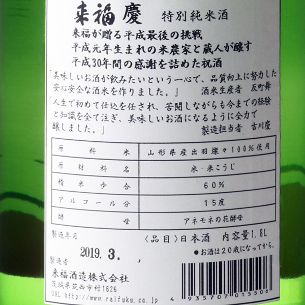 精米も出来る限り自社精米をしており、酵母もほとんどが自社培養しており、いい米が良い麹を造り、いい酵母とミックスされ来福酒造の製品が完成していきます。品質一本、真向勝負を経営理念に、伝統技術を駆使して磨き重ねた商品の数々を、お飲みになるお客様のもとに福が来ますようにと願い造られています。