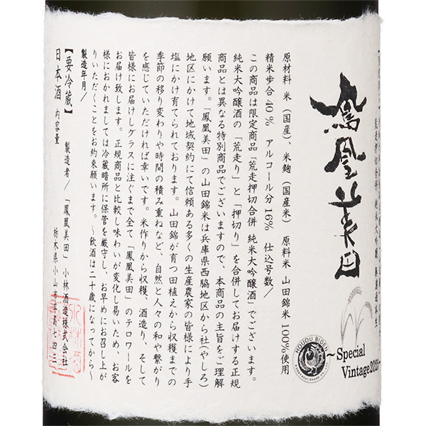 醪を絞る際、最初に圧力を掛けずに出てくるにごりを含む「荒走り」、続けて出てくるにごりのない透明な「中取り」、最後に圧力を掛けて絞ったお酒を「押し切り」と呼び、本商品では荒走りと押し切りの部分を合わせ、一本のお酒にした個性的な鳳凰美田です。蔵紹介