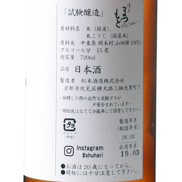 原料に勝る技術は無し!1791年創業。京都市伏見の歴史ある酒蔵で、赤レンガ蔵と八角形の煙突が印象的な酒造蔵は、近代化産業遺産に指定されています。澤屋まつもとのコンセプトは、守破離 (しゅはり) 。澤屋まつもとの伝統を守ること。伝統を破り、他で学んだことを実践すること。守と破を大切に、そこから離れて新たな価値観を見出すこと。京都の酒蔵として、京都の水、良質な米の旨みを表現。透明感、旨み、爽やかさ、シンプルな中に、エネルギーを感じられるお酒です。