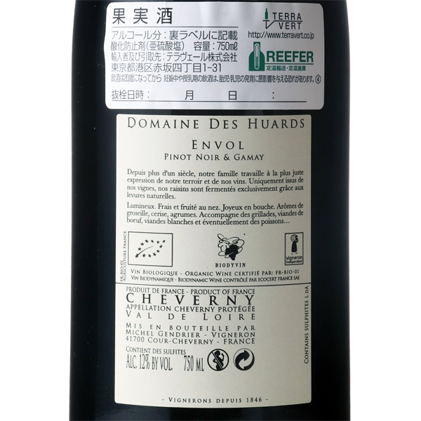 シリカを多く含む粘土石灰土壌で樹齢は20年程度。全房のまま破砕せずにステンレスタンクに投入し、低温を維持しながら7日間下部から自然発酵を行います。7日後に少しずつプレスして発酵を活発化させます。熟成はステンレスタンクのみによって行い、翌年の収穫前にボトリングしています。チェリーなど赤果実を思わせる香りとフレッシュの口当たりは、揚げ物などとも合わせて楽しめます。使用品種:ガメイ、ピノ・ノワール、カベルネ・フラン