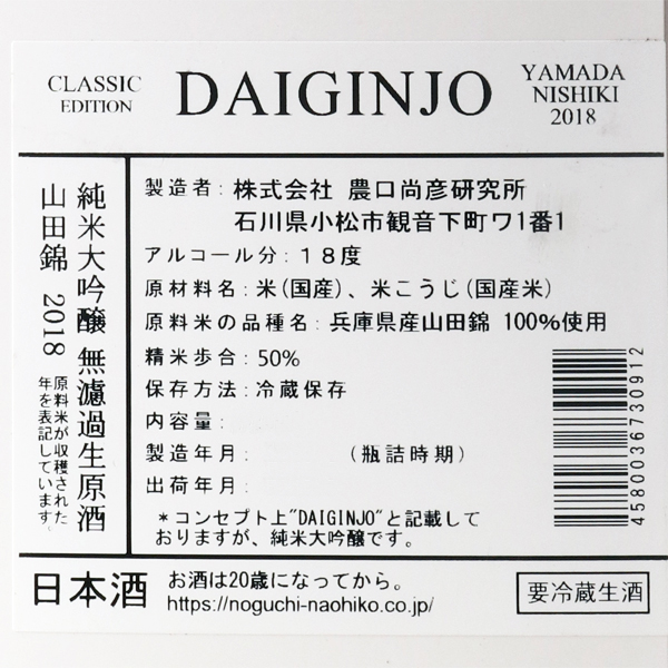 農口尚彦研究所 純米大吟醸 山田錦 無濾過生原酒 *クール便のみ