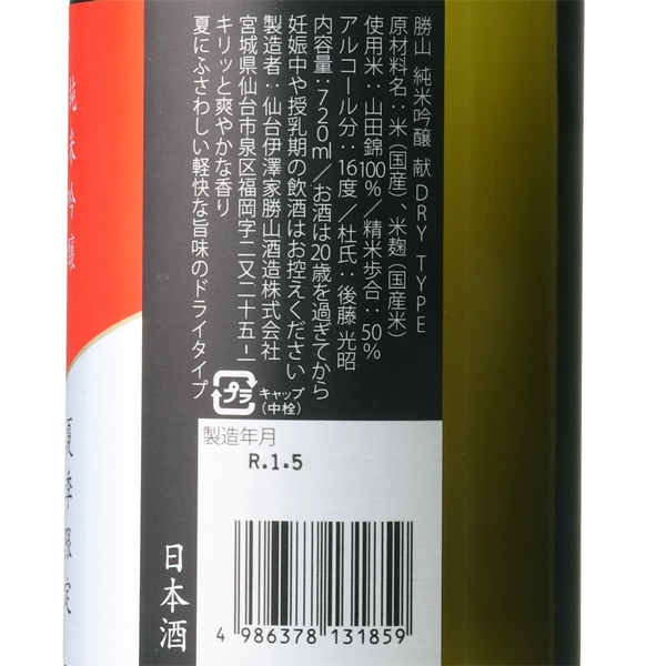 仙台で現存する唯一の伊達家御用蔵元禄元年、1688年に伊達政宗公を藩祖とする伊達家六十二万石の城下町仙台にて創業。その後、320年以上の間酒造りを続けている由緒ある酒蔵です。蔵のある地域は、お米を中心とした穀倉地帯で、泉ケ岳から湧き出る水は、勝山の仕込み水として深井戸より汲み上げ使用しています。水質は酒造りに適した軟水で、美人成分の天然シリカを多く含む、柔らかくキレイな水質となっています。勝山酒造のお酒は純米酒のみに特化しており、1週間にタンク1本の贅沢な仕込を行っています。様々な料理との相性が良く、多様な飲み方を楽しんで頂けます。