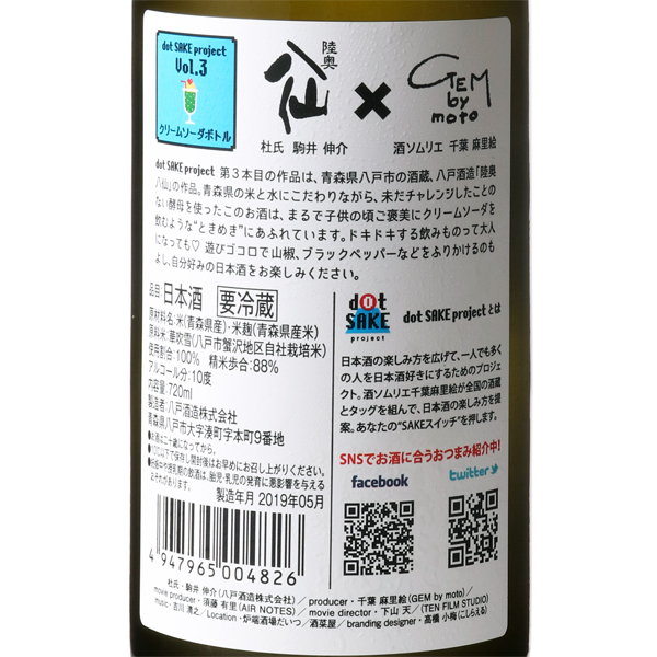 dot SAKE project 第三弾は陸奥八仙。自社田で栽培した華吹雪を初チャレンジとなったビール酵母で醸しました。ぴちぴちとした口当たりで、ほのかにライチを思わせるニュアンスがあります。個性的な名前の由来は、子供の頃、ご褒美にクリームソーダを飲むときに感じたような“ときめき”を、このお酒からも味わってほしいとの思いから。瓶にプリントされたコマンドも是非お試しください。日本酒ってこんなに楽しいんだ!とわくわくするような体験がみなさんを待っています。蔵紹介