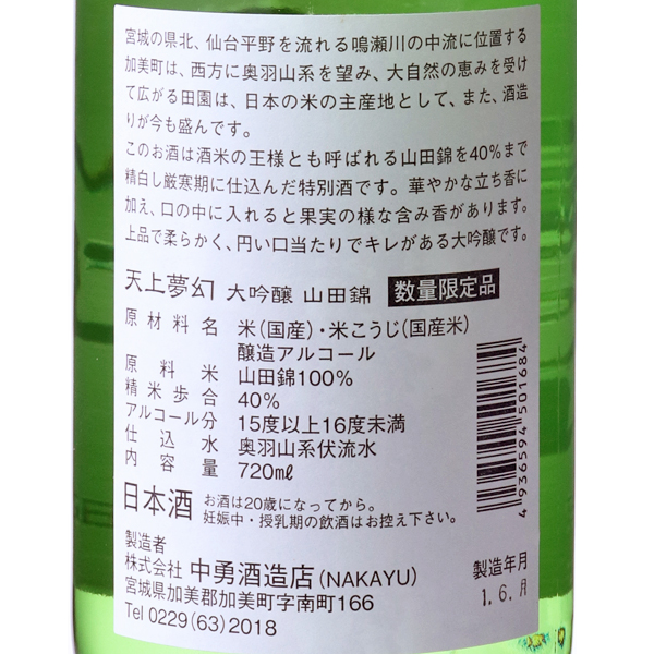 30年に及ぶベストセラー酒である「天上夢幻」の誕生は昭和50年頃。先代と登山仲間が鳴瀬川原酒を山頂に持参し、雲海を望みながら飲んだところ、同行していた画家で登山家の岡部一彦氏が「天の上で夢か幻を見ているかのような味わいだ」と表現した事から命名されました。現在では蔵で醸される日本酒の約9割が特定名称酒です。