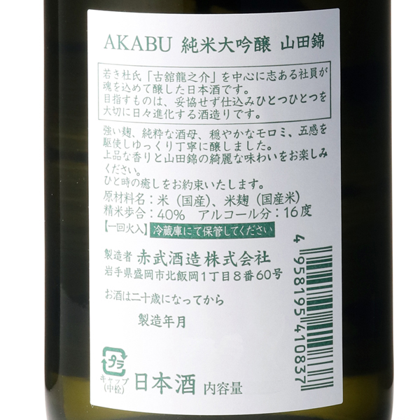 注目はその6代目が醸す日本酒「赤武 AKABU」。2014年より岩手を代表する純米酒を目指して開発しました。ちなみに6代目は1992年生まれの30代。大学時代は利き酒大会の全国チャンピオンになったこともあります。頑固な職人魂を継承し、赤武が日本を代表する純米酒になるよう醸します。蔵人の平均年齢も若く元気いっぱい。「赤武酒造の新しい歴史を創る」の合言葉で集まった若者たちが、時代に合う酒造りを理解し、岩手から情熱と愛情と根性で醸す酒を造りあげています。