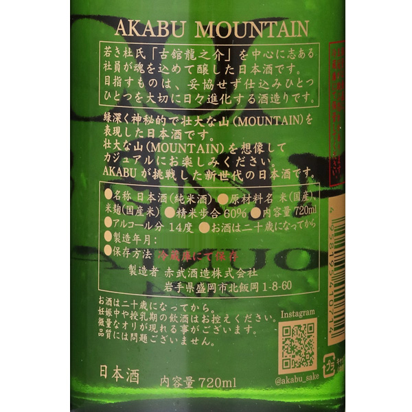 岩手県産 吟ぎんがを60%精米、MOUNTAINはSEAと比較し「奥行深く・・・深く・・・」をテーマに醸した純米酒です。緑深く神秘的で壮大な山(MOUNTAIN)を表現しました。AKABUが挑戦した新世代の日本酒、 カジュアルにお楽しみください。注意事項