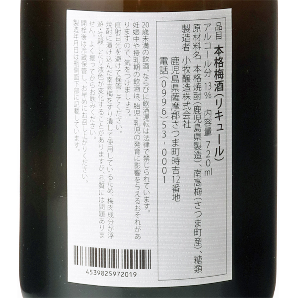 小牧醸造が造った初のリキュール。 さつま町産の南高梅を小牧の焼酎にじっくり漬け込み、さらにその果肉をペースト状にして入れ込みました。とろりとした南高梅の風味豊かな濃い梅酒をお楽しみ下さい。蔵紹介