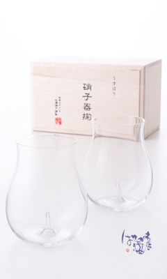大正11年(1922年)、電球用ガラスの生産工場として創業した松徳硝子が作るお酒用のグラス。職人による手仕事にこだわり、全てのグラスを手作りで製造しています。この大吟醸グラスの個性的な形状は日本酒本来の香りや味わいを楽しむことを目的に生まれました。蔵元や料理人からも高い評価を得ています。専用木箱に2つ入っているのでご贈答にもおすすめです。■ うすはり 大吟醸