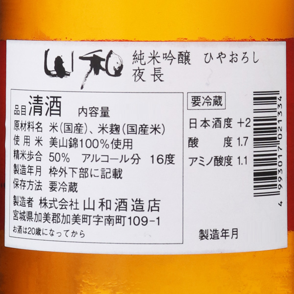 いい意味で期待を裏切るお酒明治29年、1896年創業。山形県に隣接する宮城県加美郡加美町に蔵はあります。蔵のある一帯は穀物地帯であり、豊富な米を収穫することができ、宮城を代表する米「ササニシキ」発祥の地である大崎平野が東に広がっています。蔵の代表銘柄「山和」は、2004年に誕生しました。米洗いから搾りまでをなるべく人の手で行い、丁寧な仕込みをされた純米酒だけのシリーズとなっています。目指す酒質は1杯目よりも2杯目3杯目に美味しいと感じられるお酒。流行に乗るのではなく、これが本当においしいお酒だと感じさせてくれるお酒です。