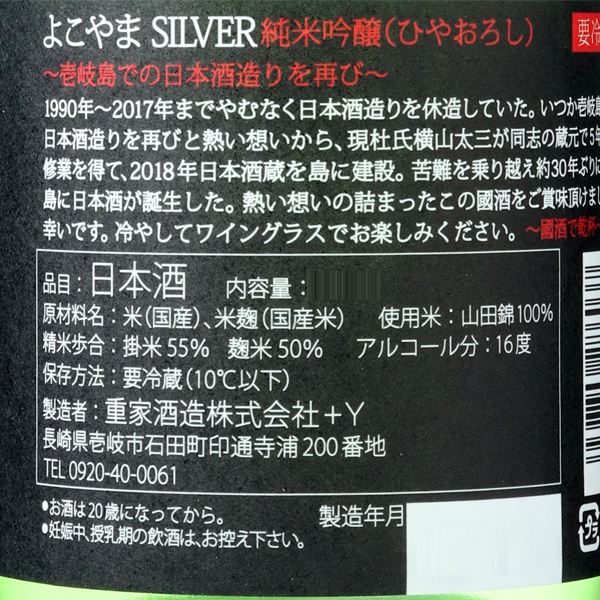 壱岐で途絶えていた日本酒造りを復活した重家酒造で醸される銘柄「よこやま」。フレッシュかつフルーティーな味わいで人気が高まる「よこやま」の、管理された冷蔵庫でひと夏じっくり熟成されたひやおろしです。 しっかりとした旨味、そして甘味と酸味のバランスが取れていますので、秋の味覚にピッタリ!秋刀魚の塩焼きやきのこをたっぷり使ったお鍋にも抜群の相性です。蔵紹介